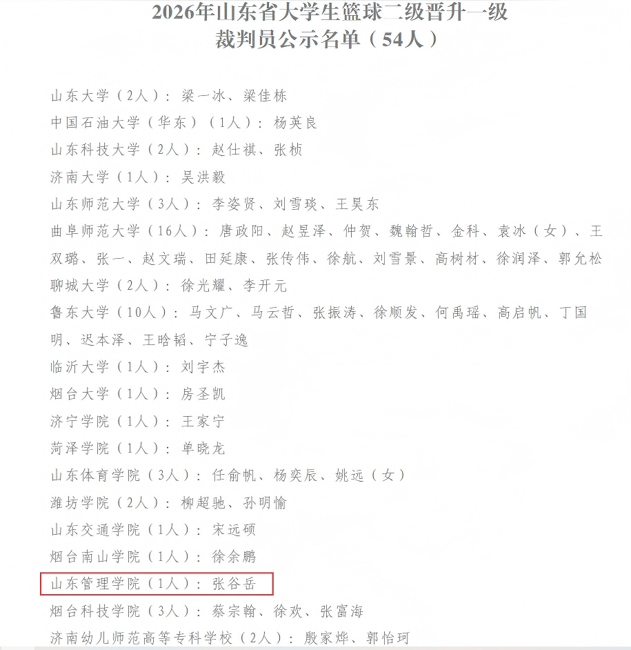 近日,2026 年山东省大学生篮球裁判员二级晋升一级考试结果公布,山东管理学院学生张谷岳顺利通过全部考核,成功晋升篮球一级裁判员,成为我校首位学生一级篮球裁判。这一成果标志着学校体育竞技人才与应用型体育人才培养取得标志性突破。